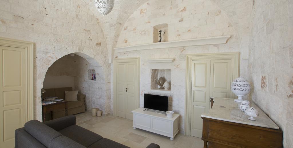 The dining area is provided with a barbecue and an oven and a big gazebo that offers a very beautiful view to the valley which is perfect for relaxation. The view is absolutely splendid, where you have an infinite view of olive trees across the valley and an ancient vineyard inherited from ancestors, where the famous wine of Verdeca and Minutolo is produced. Also there is a garden, where guests can harvest fresh seasonal vegetables for household use.